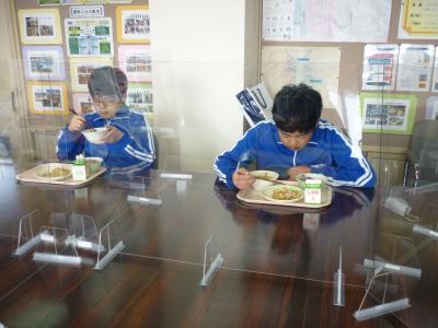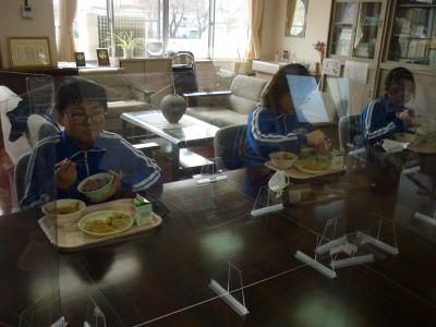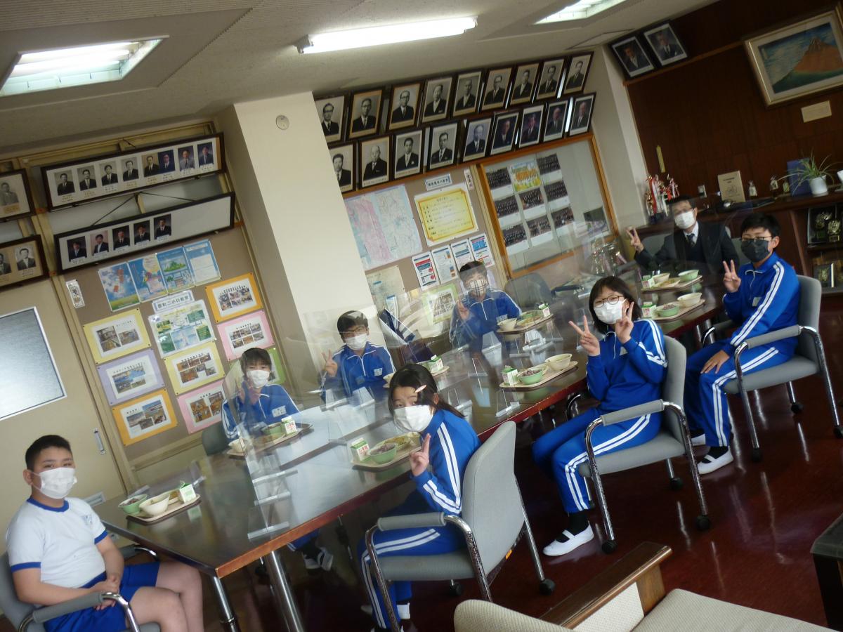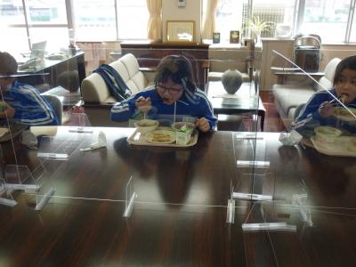 2021年3月8日 13時24分今日から、卒業生が校長室に来て、一緒に給食を食べることにしました。もちろん、コロナ感染防止を行い実施しています。人数は6~7名、十分間隔を開け、左右と前にパーティションを立て、会話をするときはマスクをして食べています。子供たちは、小学校の思い出や中学校での部活、今不安に思っていることなどを話していました。今週1週間、楽しい思い出になるようにしたいですね。