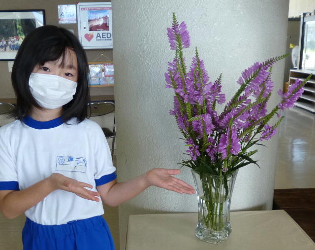2021年9月7日 11時34分花いっぱいの原町二小。今日もご家庭からお花を頂きました。よく見かける花ですが、名前を知らなかったので花に詳しい方に聞いてみたところ「ハナトラノオ」という名の花だそうです。