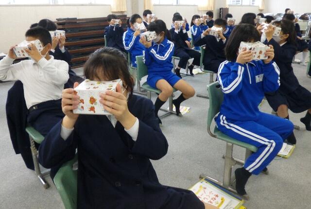 後半は、スマホ画面を使ったVR体験。地震と津波のバーチャル体験ができました。子ども達は、簡易ゴーグルを上下左右に動かして、地震や津波の様子を観察することができました。イマドキな手法です。