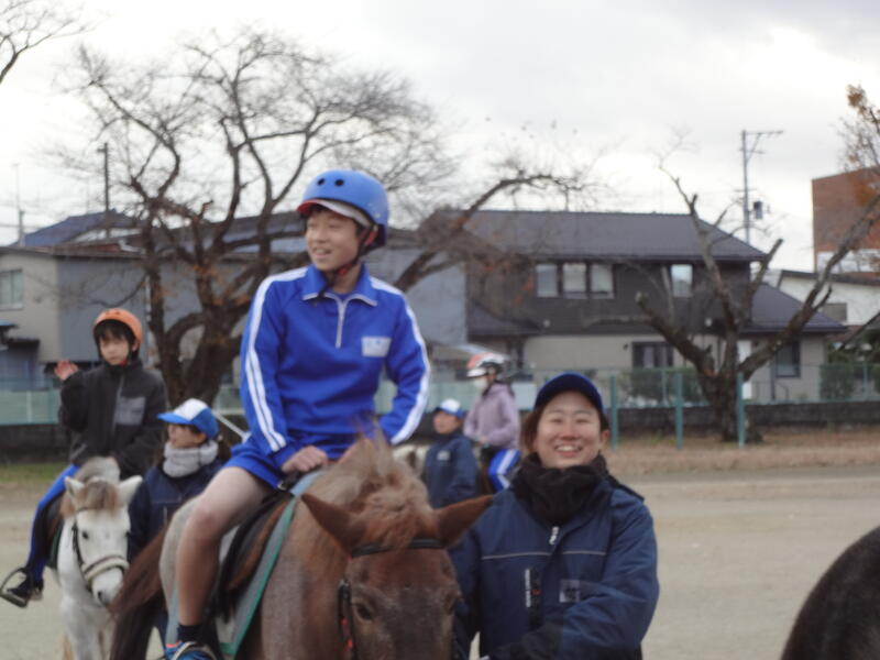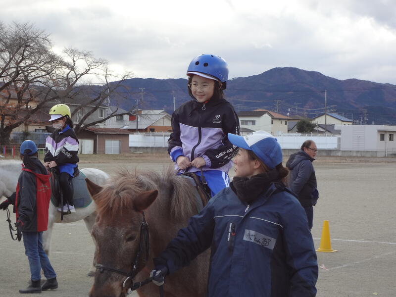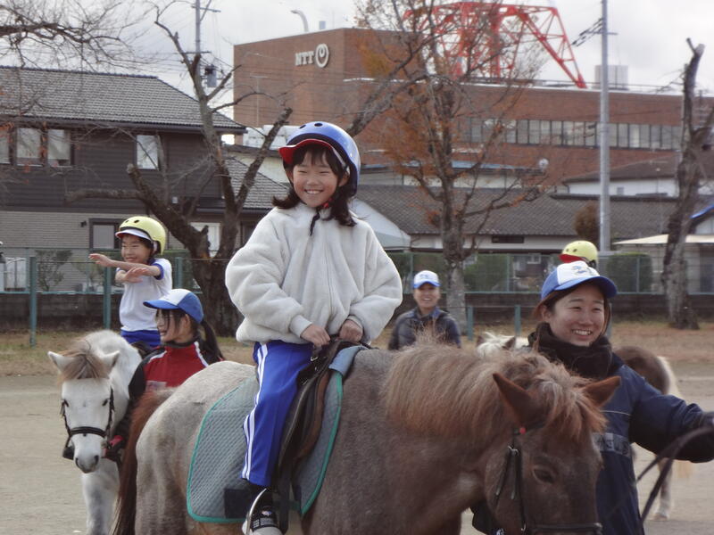 2年生と6年生が乗馬やえさやりを体験しました。笑顔で乗る子、ちょっとおそるおそる乗っている子、それぞれでしたが、お馬さんたちに癒やされる楽しい時間となりました。