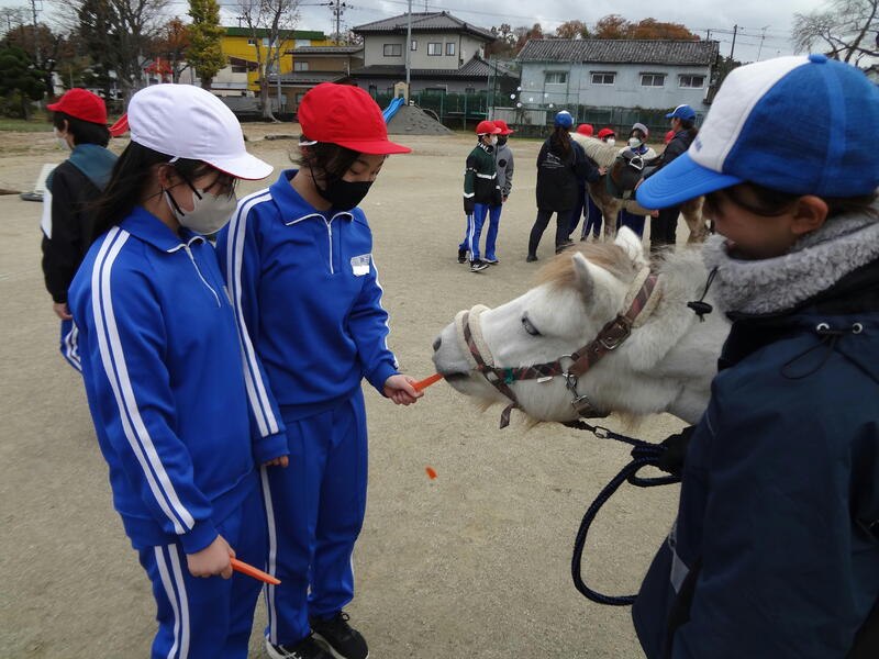 2023年11月30日 15時34分今日は、「マメ丸」「うらら」「オリーブ」「バジル」のお馬さんたち四頭が原町二小にやってきました。