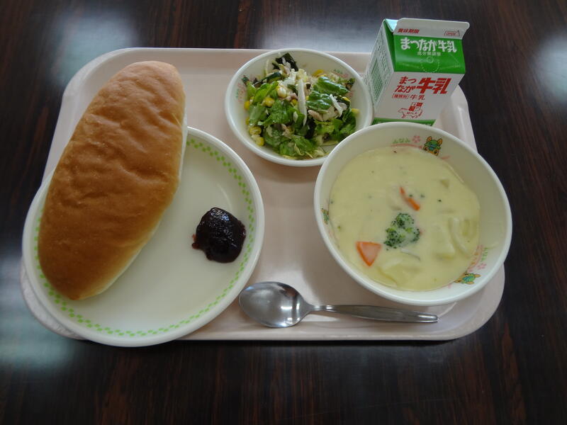 今日の給食は、コッペパン・ぶどうジャム・ホワイトシチュー・ビタミンたっぷりサラダ・牛乳でした。
