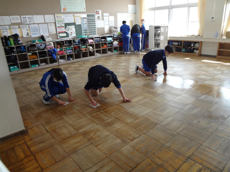 子どもたちが下校した後、教職員で教室のワックスがけを行いました。