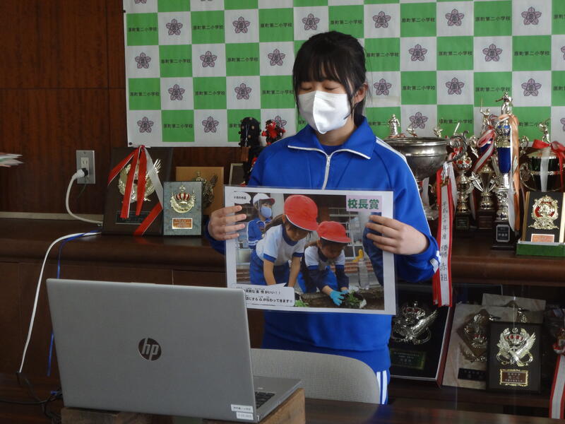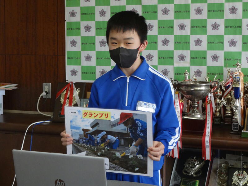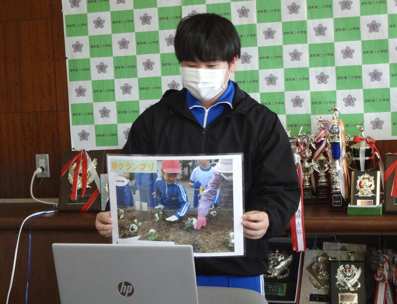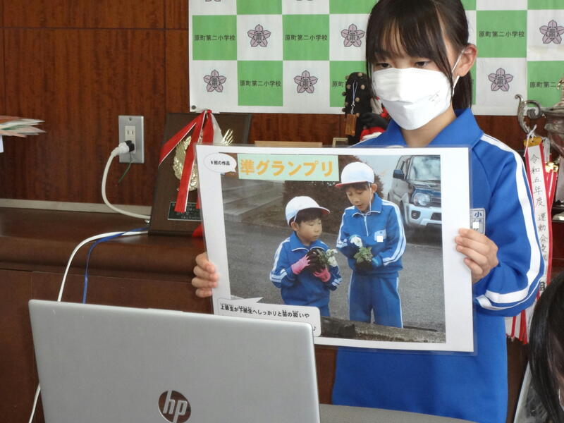 「花いっぱい活動」のフォトコンテストのグランプリ・準グランプリ・校長賞の発表を全校リモート集会で行いました。
