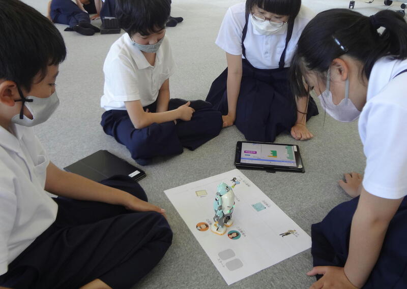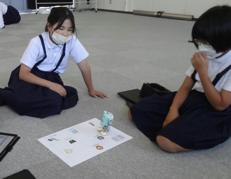 2024年6月19日 14時55分多目的室をのぞいてみると、5年生がロボットを動かして、「犯人確保をめざすボードゲーム」にチャレンジしていました。
