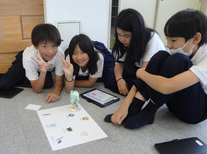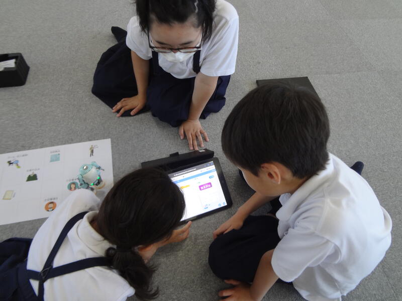 まず、目撃者のマスに動かそうと、グループで「〇歩動かせばいいんじゃない。」「ここで右を向かせないと。」と、試行錯誤しながらタブレットでプログラムを組み込んでいきます。