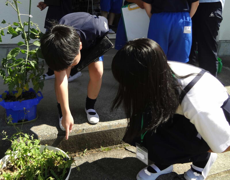 「一日校長先生、見て見て。」とミニトマトを観察していた2年生から声をかけられています。