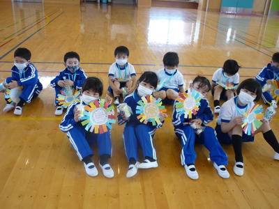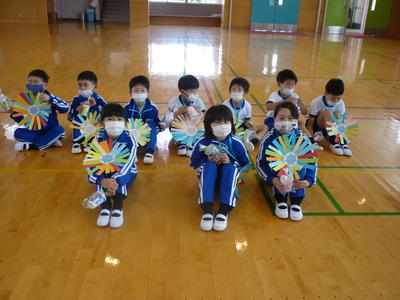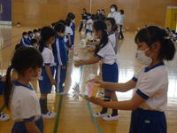 2020年5月26日 10時27分本来であれば、全校児童で1年生をむかえる会を行うところですが、コロナ感染の対応から、今年度は在校生を代表して2年生が1年生とむかえる会を行ってくれました。体育館で3密にならないように注意しながら、楽しい一時を過ごしました。最初に、2年生のお兄さんとお姉さんから、メダルと松ぼっくりのおもちゃをプレゼントしてもらいました。1年生はとっても大喜びでした。次に、2年生が1年生に校歌を披露してくれました。実は、1年生にとっては、校歌を聴くのは初めてでした。最後に、全員で「パプリカ」を踊って会を終了しました。1年生にとっては、初めての行事で、とても喜んでいました。