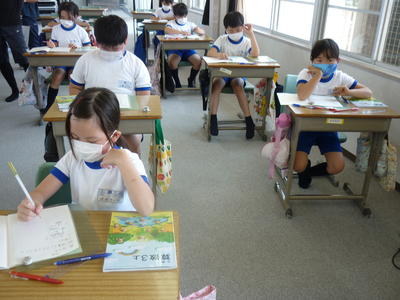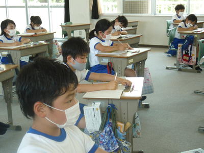 2020年6月11日 10時19分昨日、3年生の担任緑川先生が、研究授業を行いました。算数科の授業で、単元が「たし算とひき算」でした。買い物をしてという想定で、どうやって暗算をすればよいかを考える授業でした。子ども達は、さくらんぼ計算やおよその数から考えていました。自分の考えをしっかりとノートにまとめ、発表していて、さすが中学年だと感じました。これから持って難しい内容になっていきますが、しっかりと学習してほしいと思います。