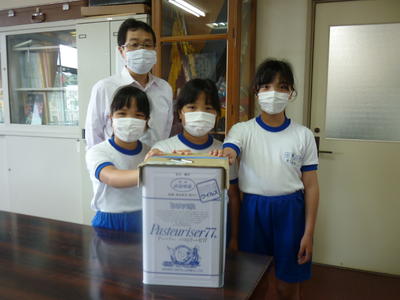 2020年6月11日 14時57分先日、3年生の横川怜依奈さん、横川恵伶奈さん、5年の横川莉央奈さんのお父様より、消毒液18リットルの寄贈がありました。消毒液は、なかなか入手困難なときに子ども達のためにと学校へ届けていただきました。現在、トイレの所や玄関等に消毒液を置いていて常に児童が使えるようにしています。また、給食の始まりには、先生が全児童分の机を消毒しています。子ども達のために有効に活用させていただきます。ありがとうございました。