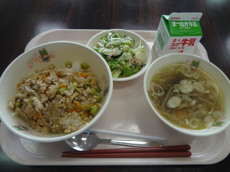 今日の給食は、そぼろ丼・ドレッシングサラダ・もずくスープ・牛乳でした。