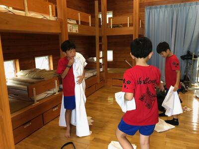 ベッドメーキングの時間です。友達と一緒に過ごす時間は、今からわくわくしますね。