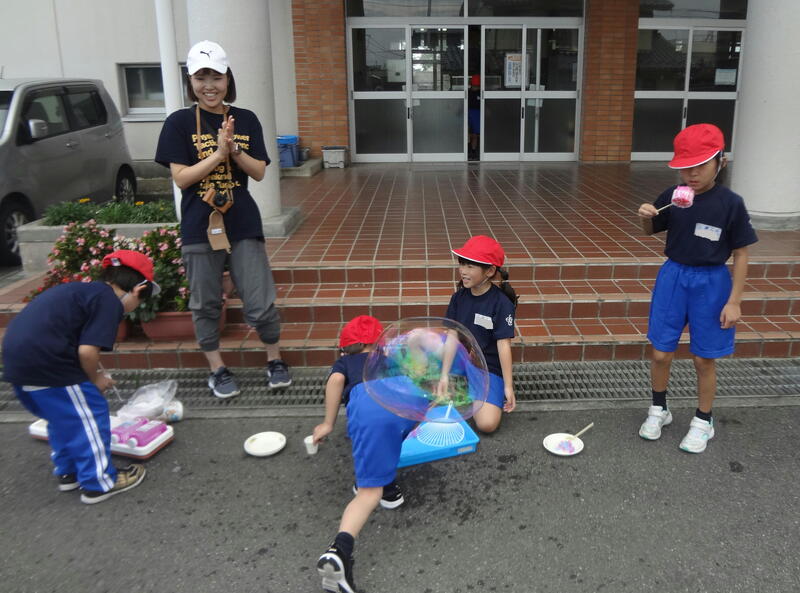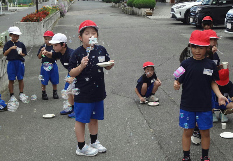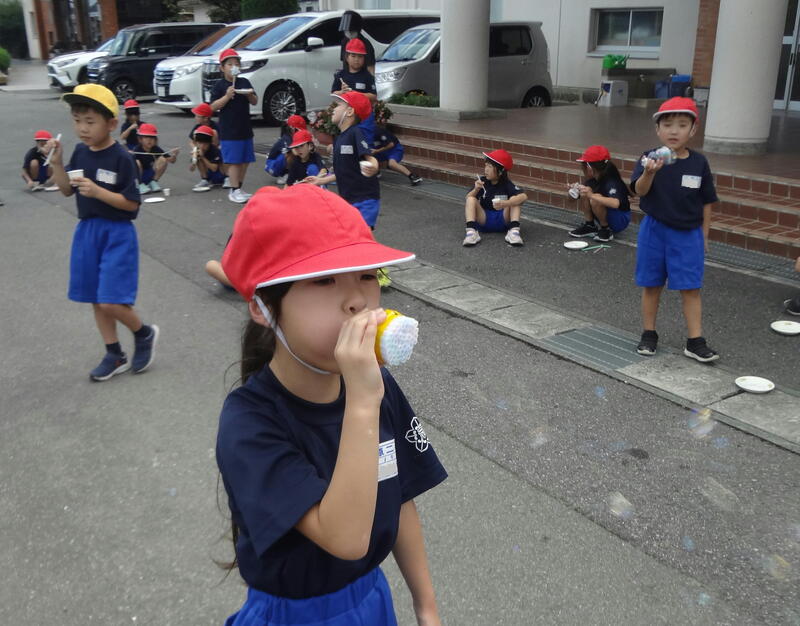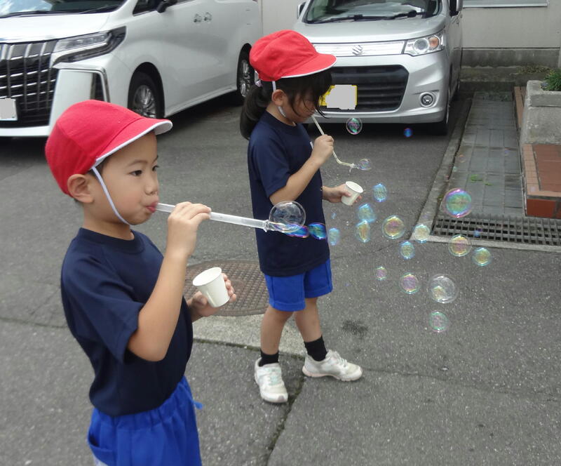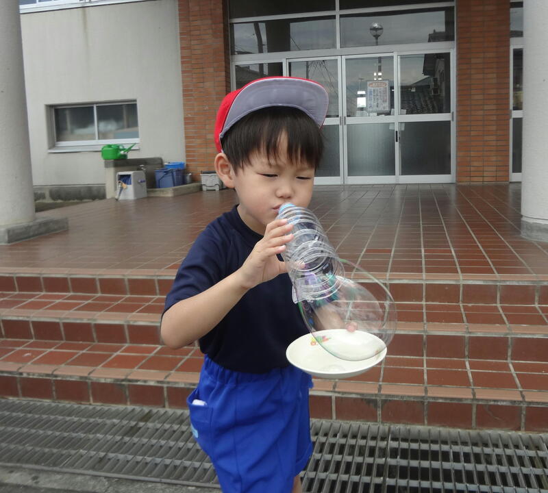 今日は、家で考えてきた道具を使って、シャボン玉を飛ばしていました。