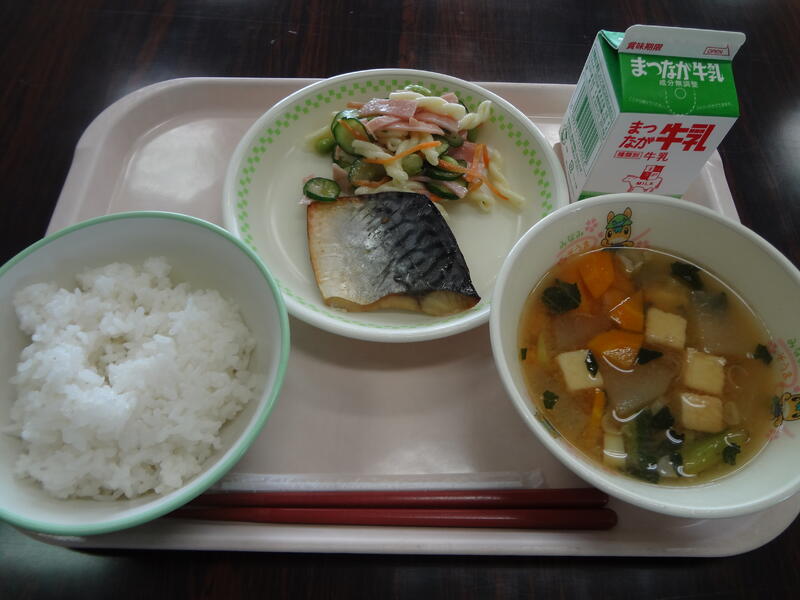 今日の給食は、ごはん・さばのサラサやき・マカロニサラダ・冬瓜(とうがん)のみそ汁・牛乳でした。