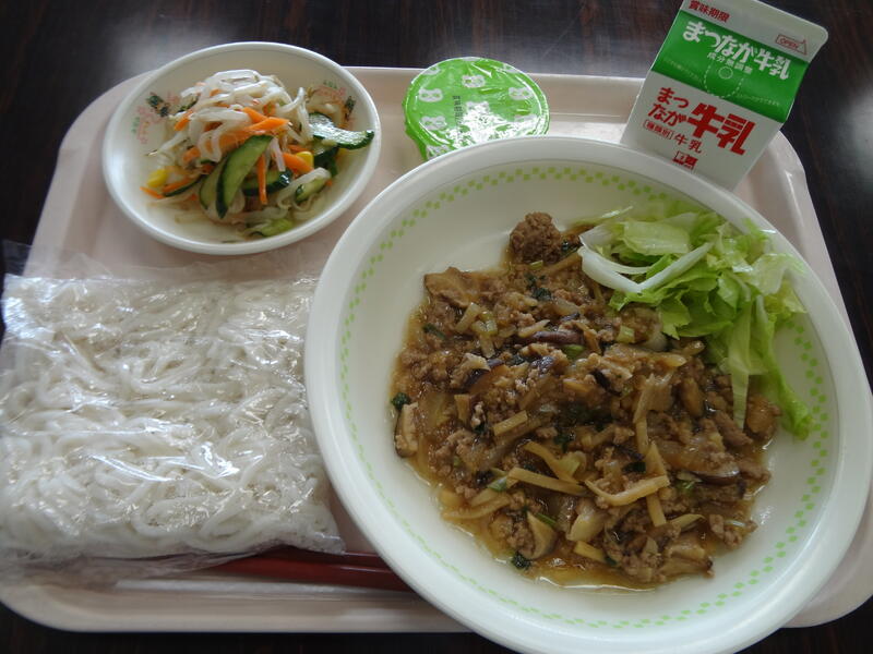 今日の給食は、じゃじゃめん・シャキシャキサラダ・県産ひとくちりんごコンポート・牛乳でした。