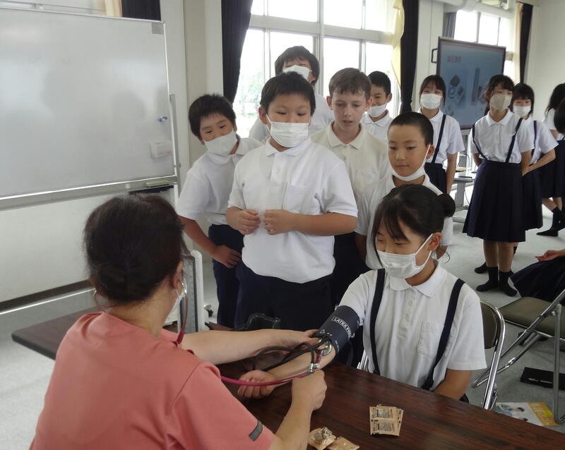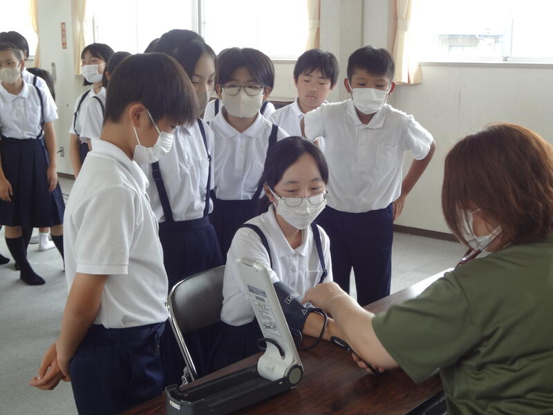 その後は、血圧測定の体験です。一人一人が血圧を測定してもらいました。