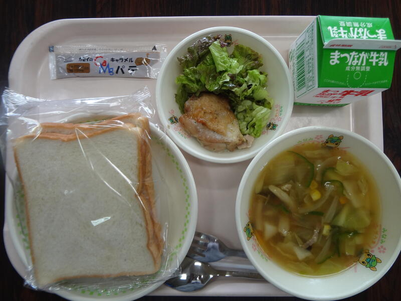 食パン・キャラメルクリーム・鶏肉のハーブ焼き・カレースープ・牛乳でした。