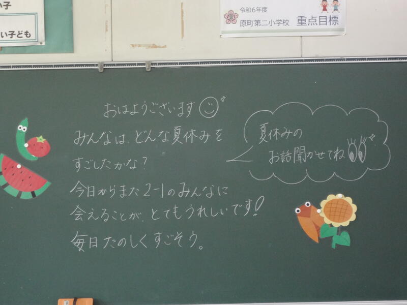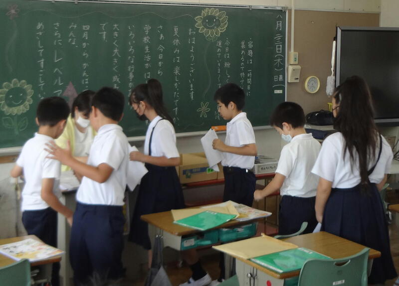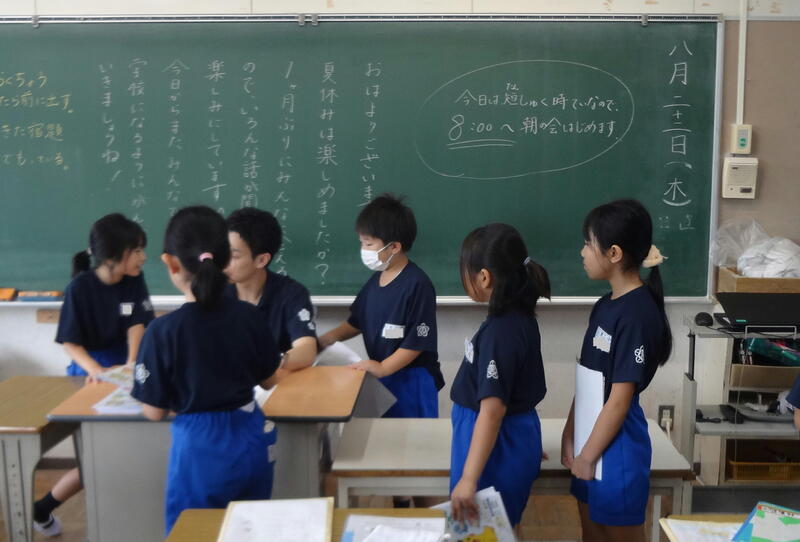 朝、教室をのぞいてみると、担任に夏休みの思い出を楽しそうに話す姿や宿題を提出しているようすが見られました。