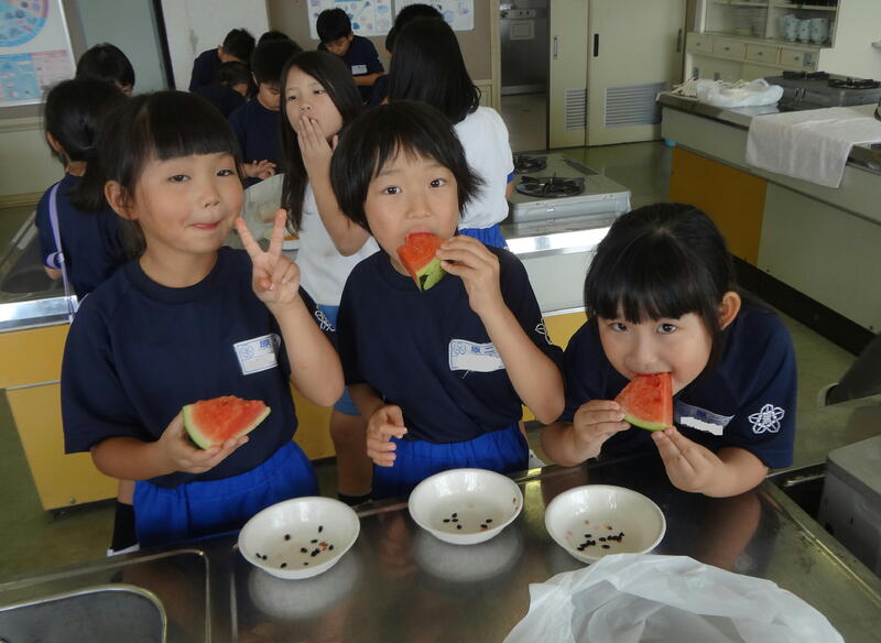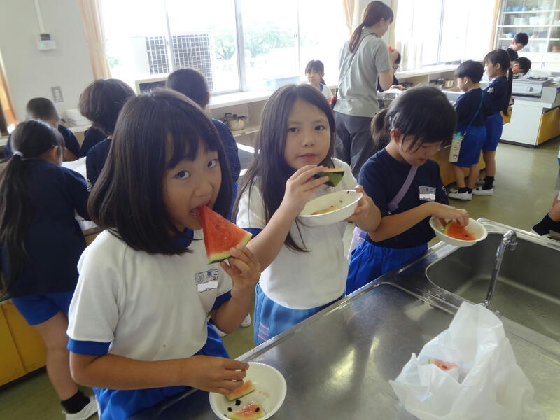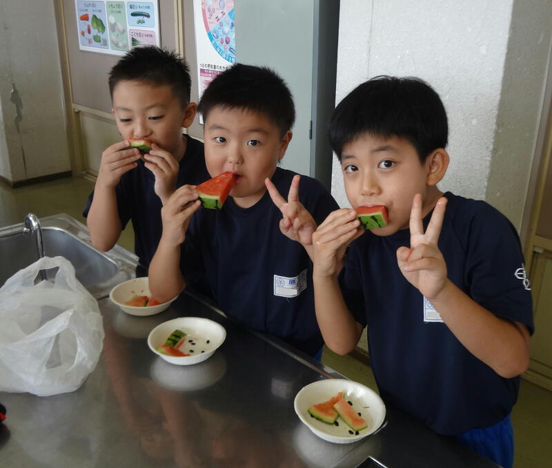 2年生が、学級畑で育てたスイカを収穫しておいしそうにほおばっていました。
