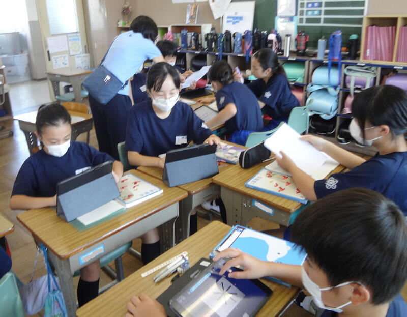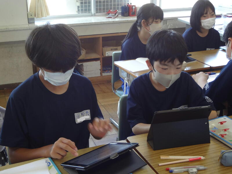 自分はどのように考えたかをタブレットやワークシートに書き込んでいました。