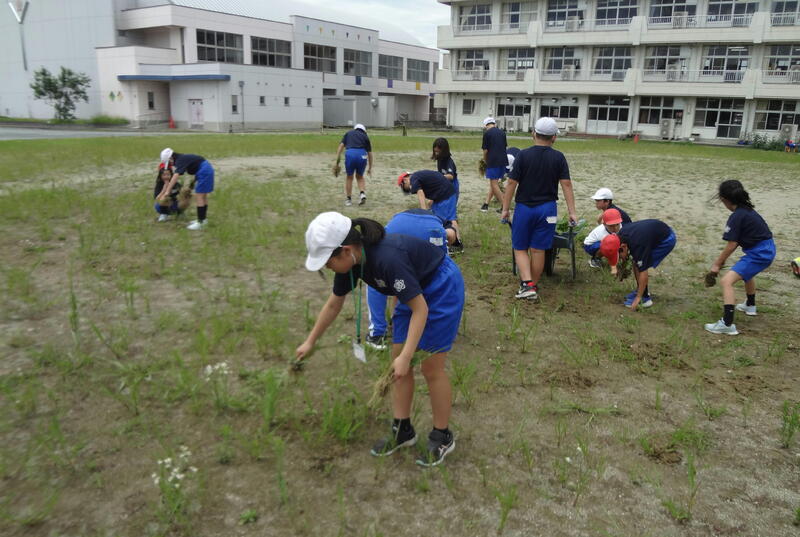 すると、今日が最後の昼休みにもかかわらず、1年生から6年生が(先生も)校庭に出て、草むしりをしてくれました。
