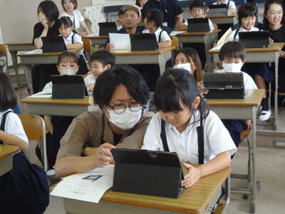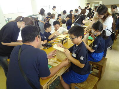 タブレットの使い方や木工教室、裁縫など、お父さんお母さんに手伝ってもらいながら、学習が進められていました。