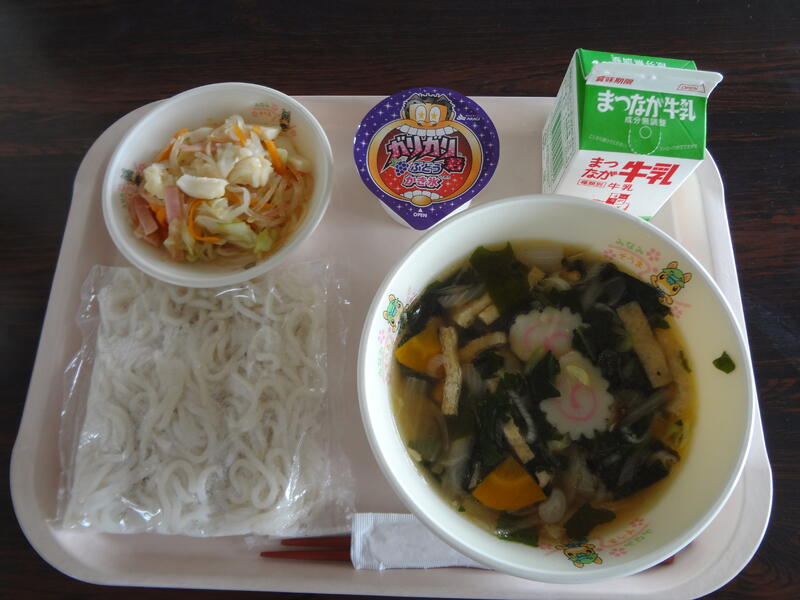 今日の給食は、わかめうどん・ちぐさ和え・ガリガリ君(ぶどう)・牛乳でした。