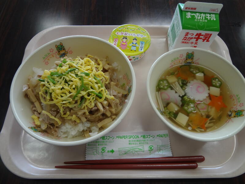 今日の給食は、のっけどん・たなばたじる・たなばたゼリー・牛乳と七夕献立でした。