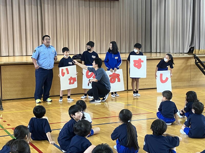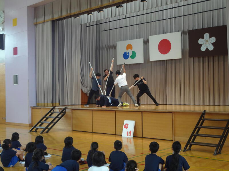 体育館に移動後は、子どもたちの前で実際にどのように取り押さえたのかを実演しました。さすまたの使い方を教職員が学ぶ場面でもあります。