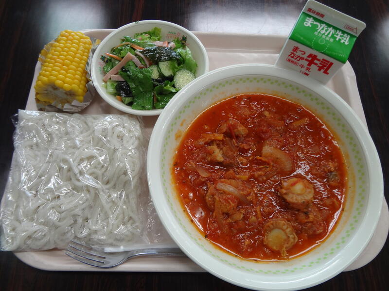 今日の給食は、ツナとトマトのスパゲティ・さっぱりサラダ・蒸しとうもろこし・牛乳でした。