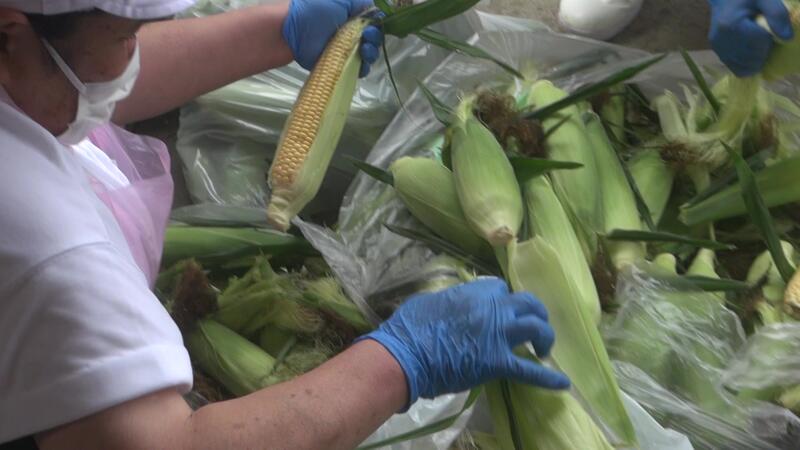 昨日収穫したばかりのトウモロコシを調理員さんが皮をむいて,洗ってカットして蒸してくれました。