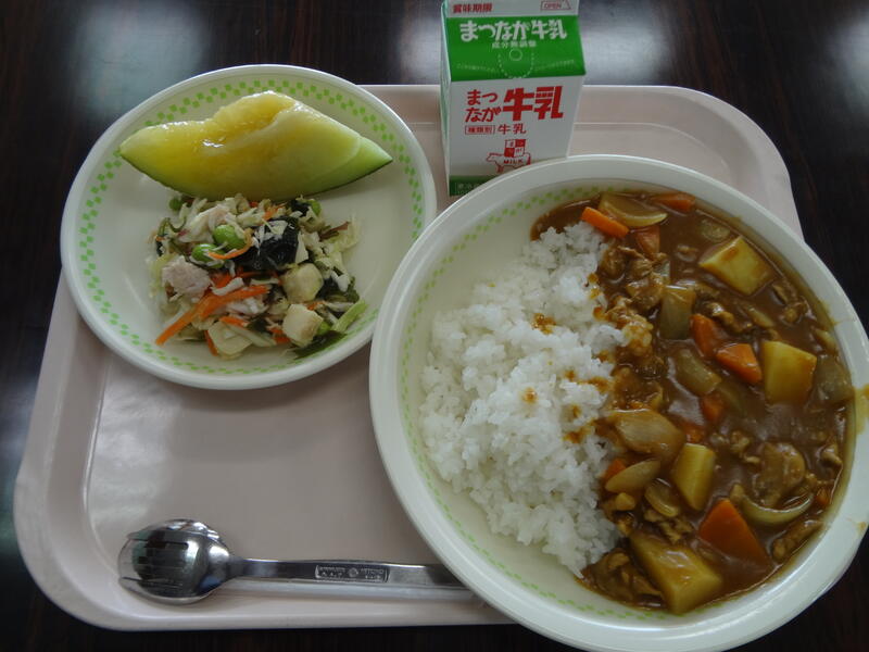 今日の給食は、ポークカレー・とうふのサラダ・メロン・牛乳でした。