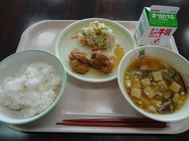 2024年6月27日 12時05分今日の給食は、ごはん・とりにくのレモンづけ・キャベツのおかか和え・なまあげ入りけんちんじる・牛乳でした。
