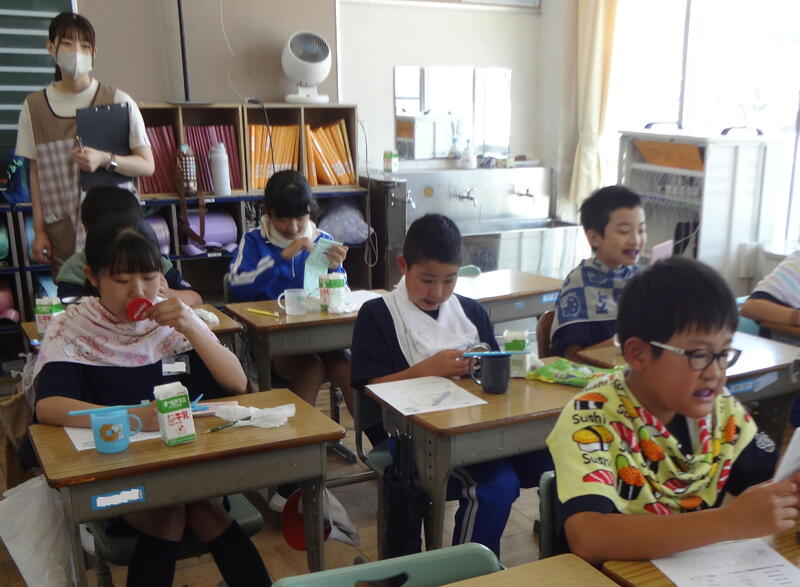 健康づくり課の方が講師として、歯の染め出での磨き残しのチェックや歯磨きの仕方等を学びました。