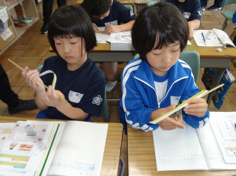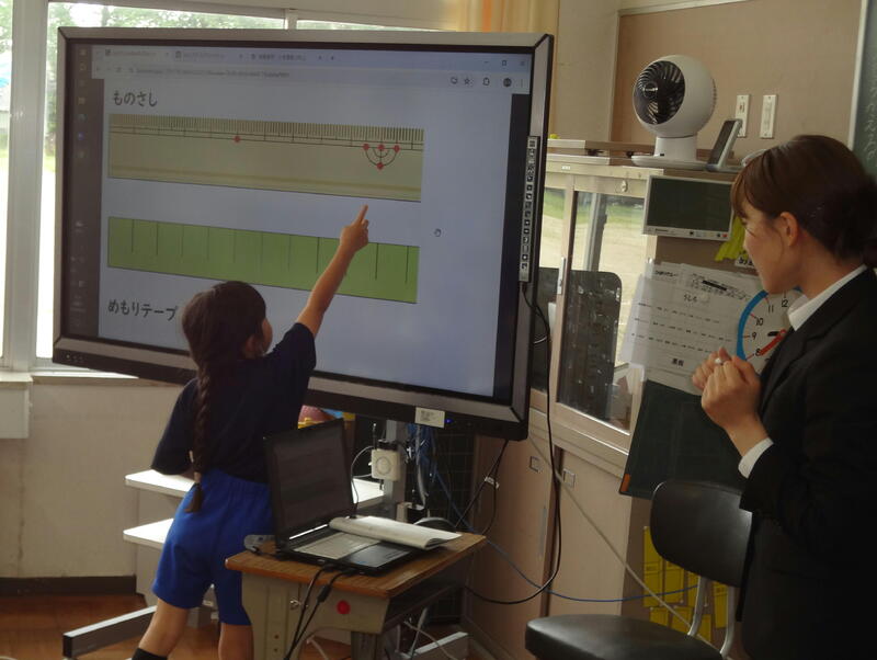 はがきのたての長さを測ってみると、「あれ、ぴったりはかれない。」「はんぱなところがある。」