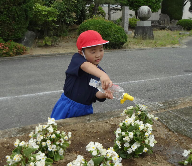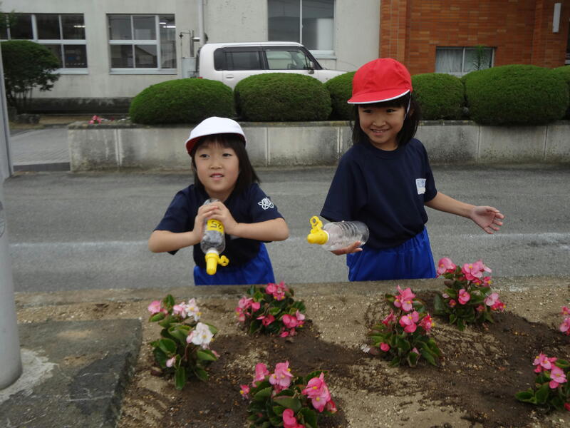 環境委員会からの呼びかけで、子どもたちが花壇に水やりを行っています。