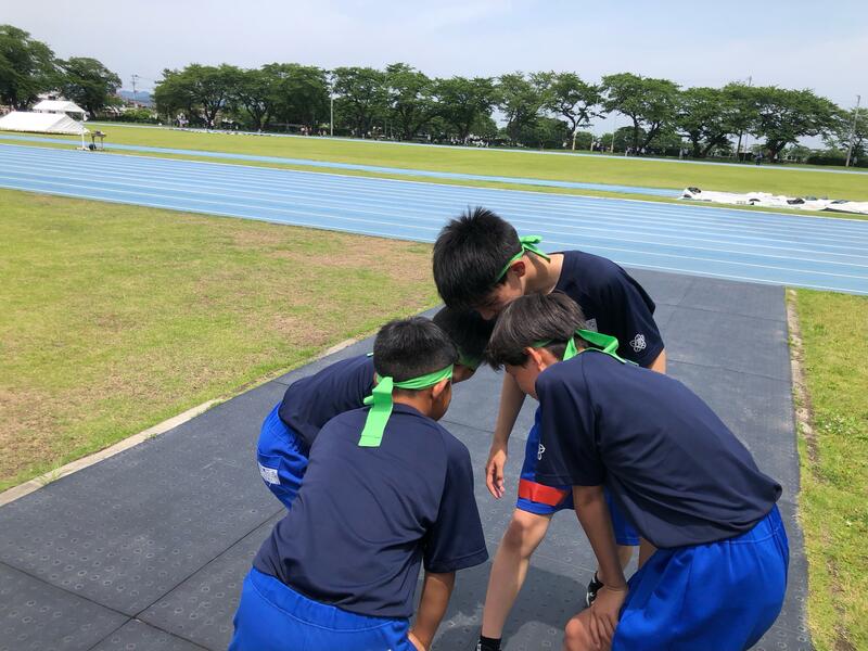 リレー前に円陣を組んで気合いを入れている男子リレーメンバーの4人。
