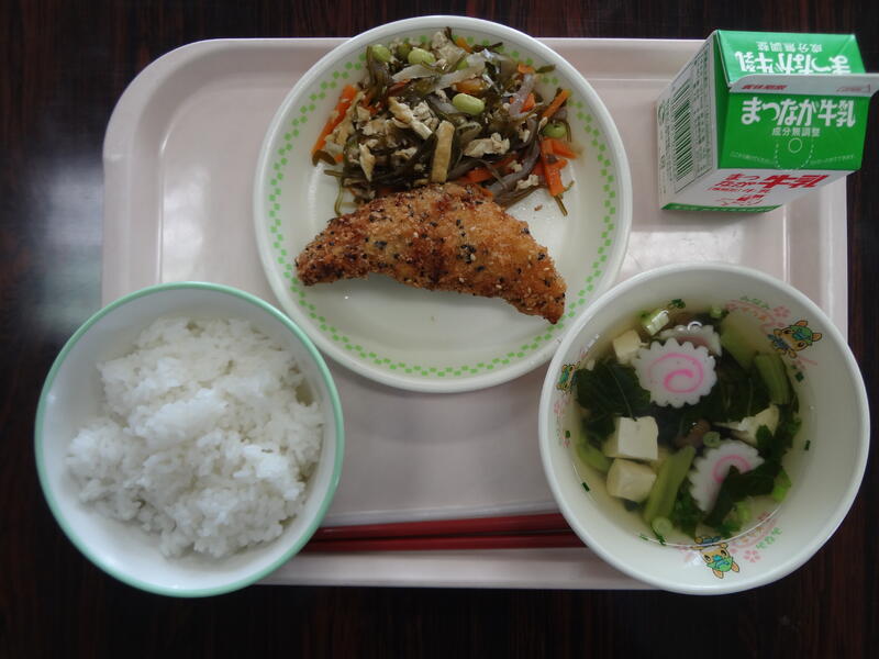 今日の給食は、ごはん・赤魚のかおりあげ・切りこんぶの炒め煮・すましじる・牛乳でした。