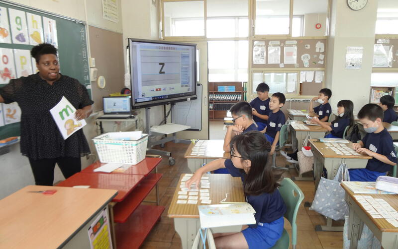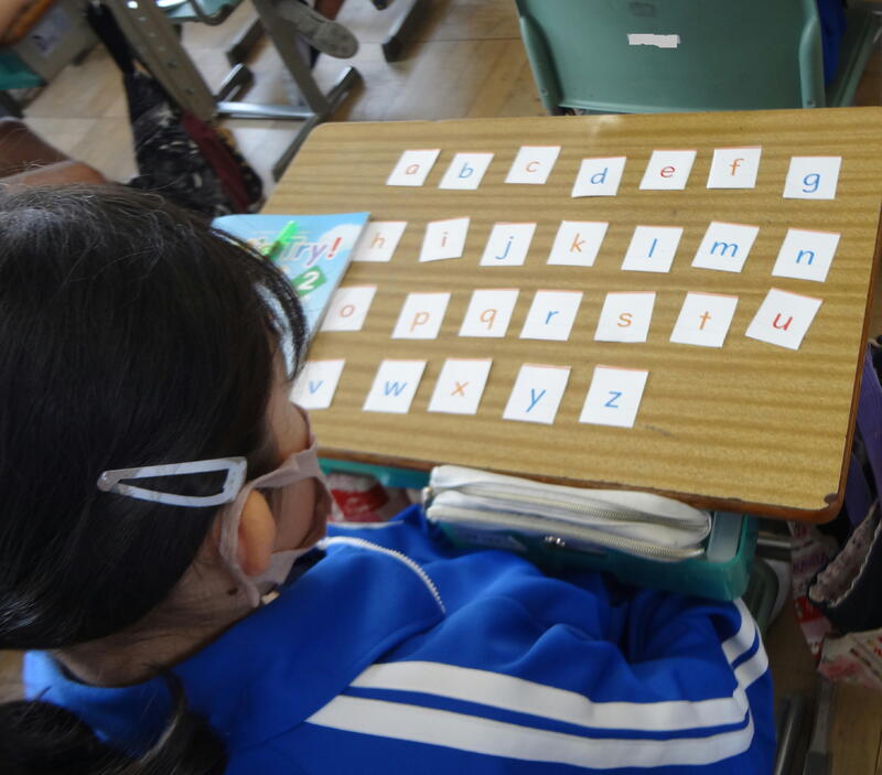切り取ったアルファベットのカードを机に並べて、ALTと楽しく学んでいました。