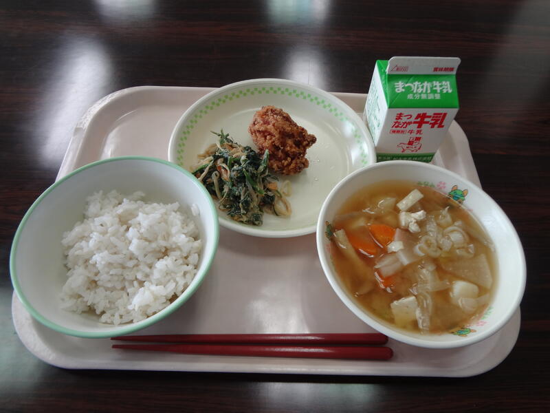 今日のメニューは、むぎごはん・にんにくのからあげ・ほうれんそうのきなこあえ・みそけんちんじる・牛乳でした。