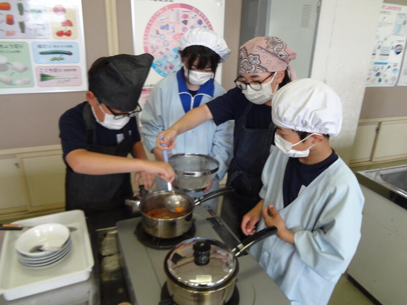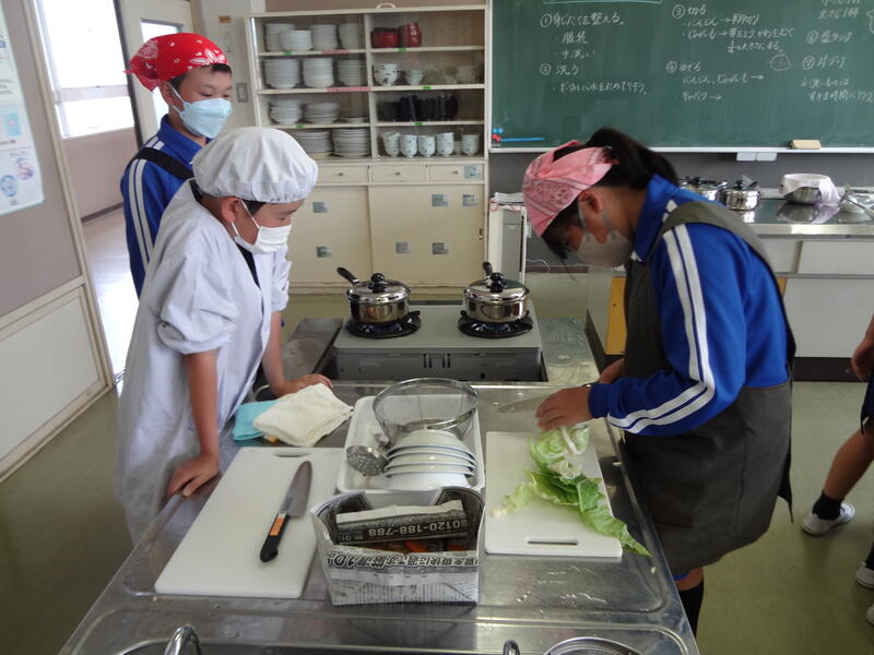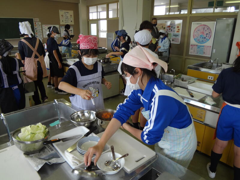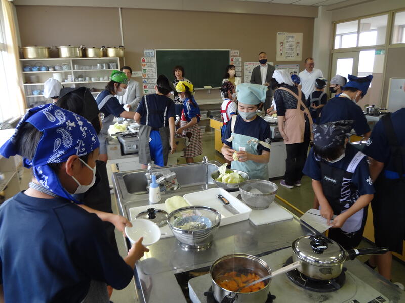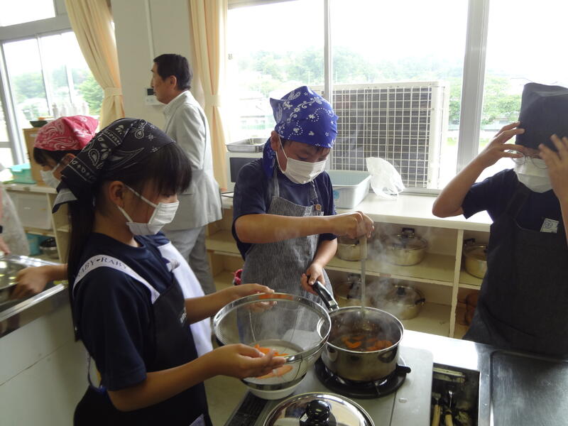 評議員さんと調理室をのぞいてみると、5年生が、家庭科の学習で「ゆで野菜のサラダ」づくりを行っていました。