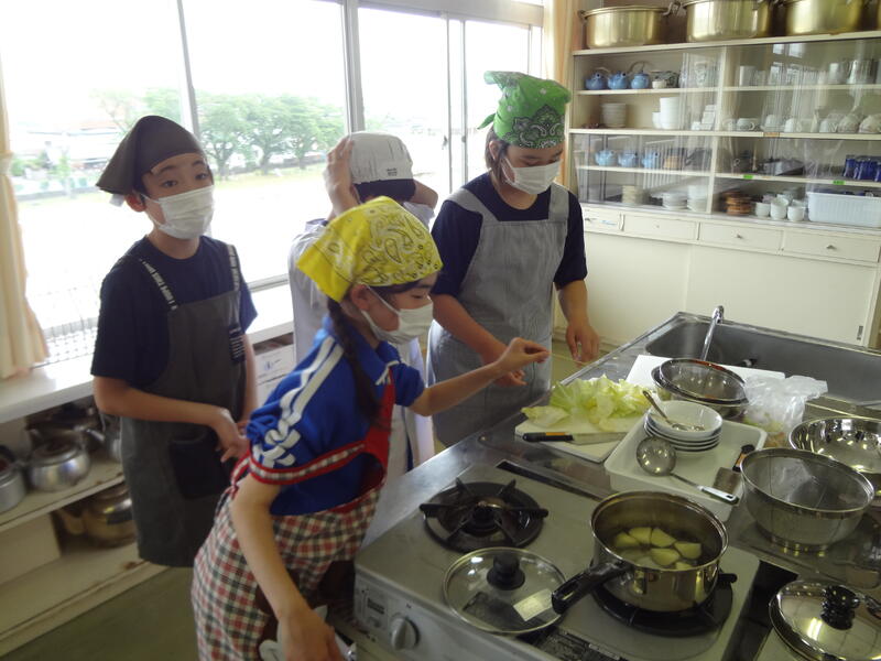 キャベツ・にんじん・じゃがいもに串を通し、ゆで具合を確かめながら調理していました。
