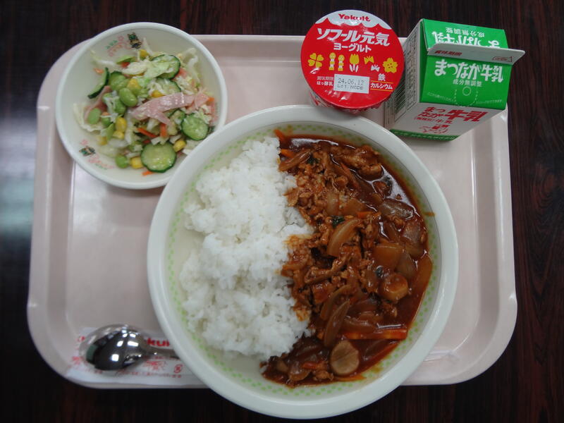 2024年5月28日 11時34分今日の給食は、ハヤシライス・コーンとハムのサラダ・ヨーグルト・牛乳でした。