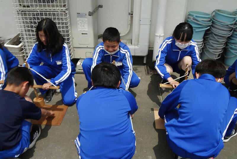 石器や土器、毛皮などに触れた後、火おこし体験を行いました。
