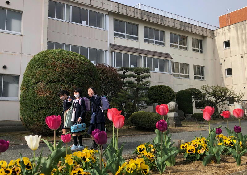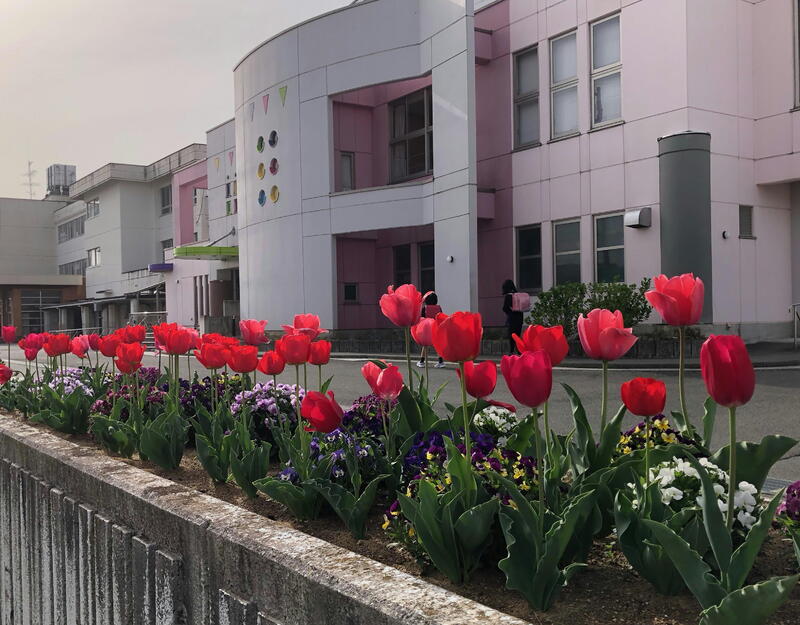 色とりどりのチューリップやパンジーが咲きほこる中、ひばりっ子が登校してきます。