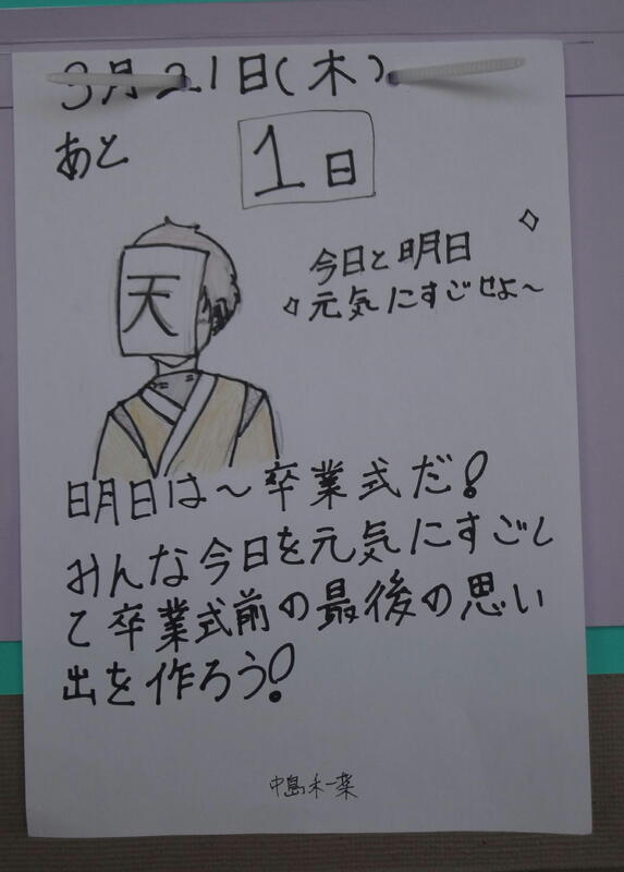 明日は、修了式・卒業証書授与式です。今年度も終わります。