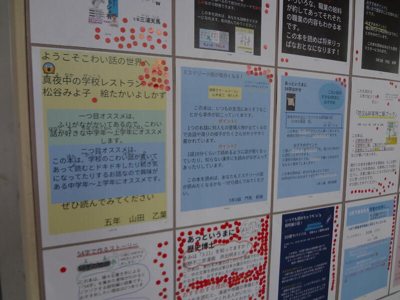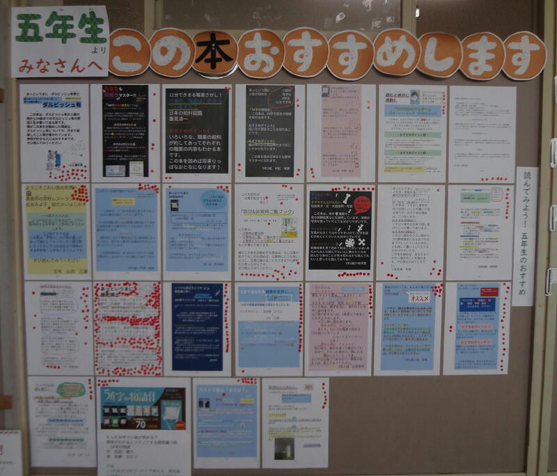 5年生は、おすすめの本をタブレットでまとめ、学校図書館前に掲示しました。