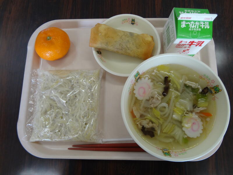 今日の給食は、タンメン・手作りはるまき・みかん・牛乳でした。