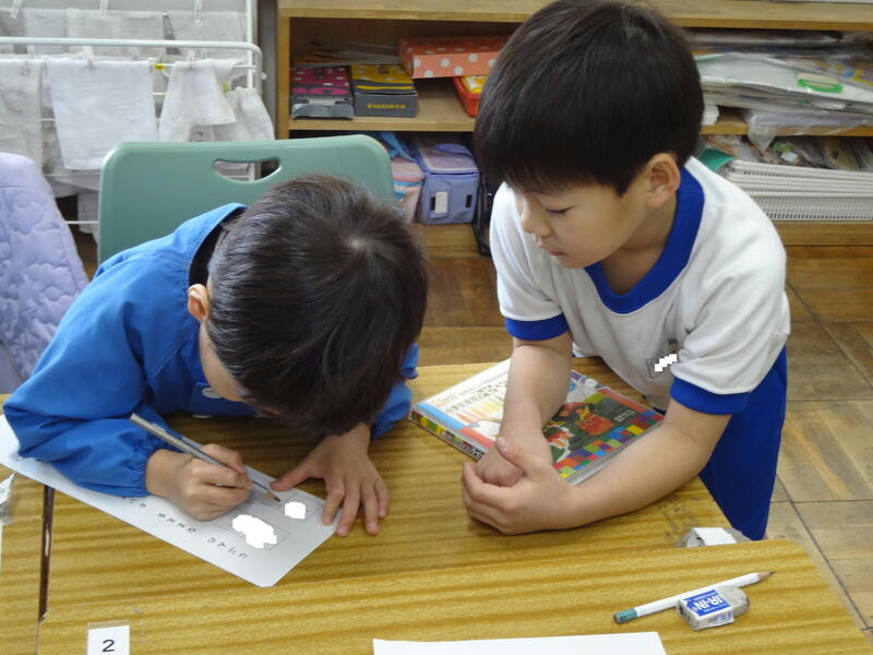 1年生が書いた名前のお手本を見ながら、自分の名前をひらがなで書いています。真剣です。