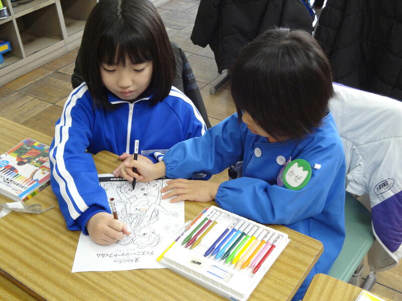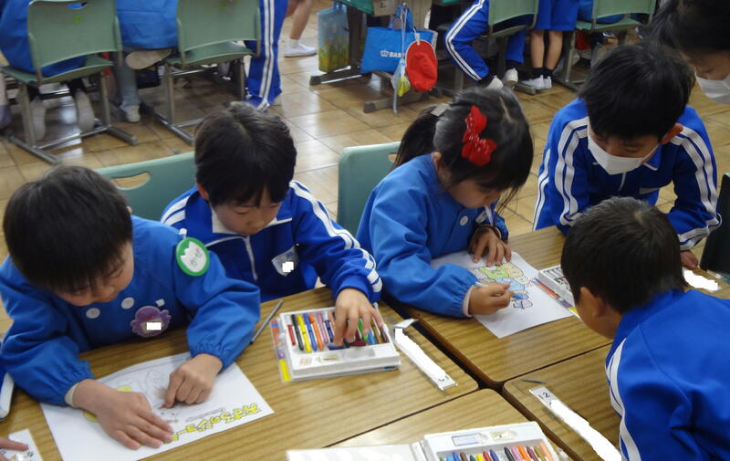 次は図画工作です。一緒にぬりえを楽しみました。